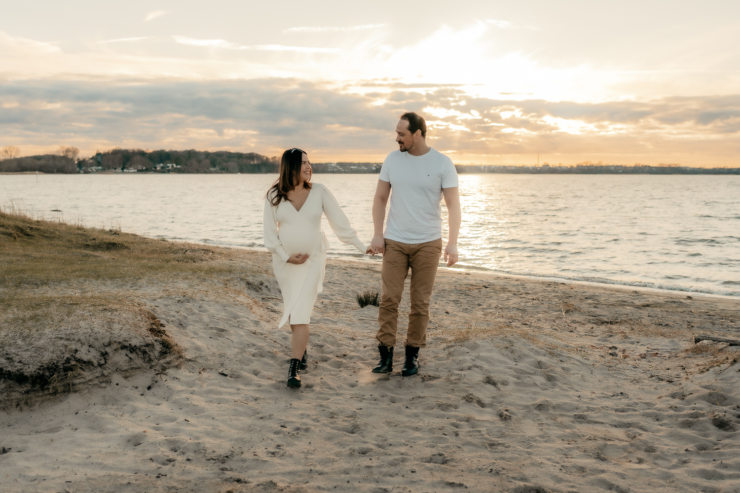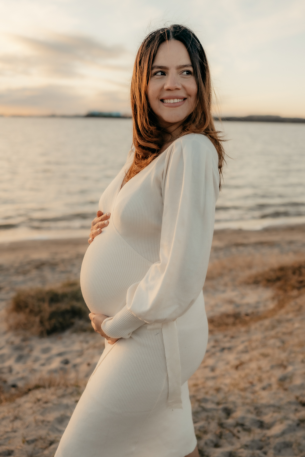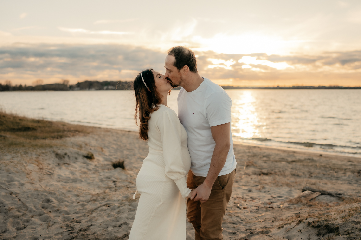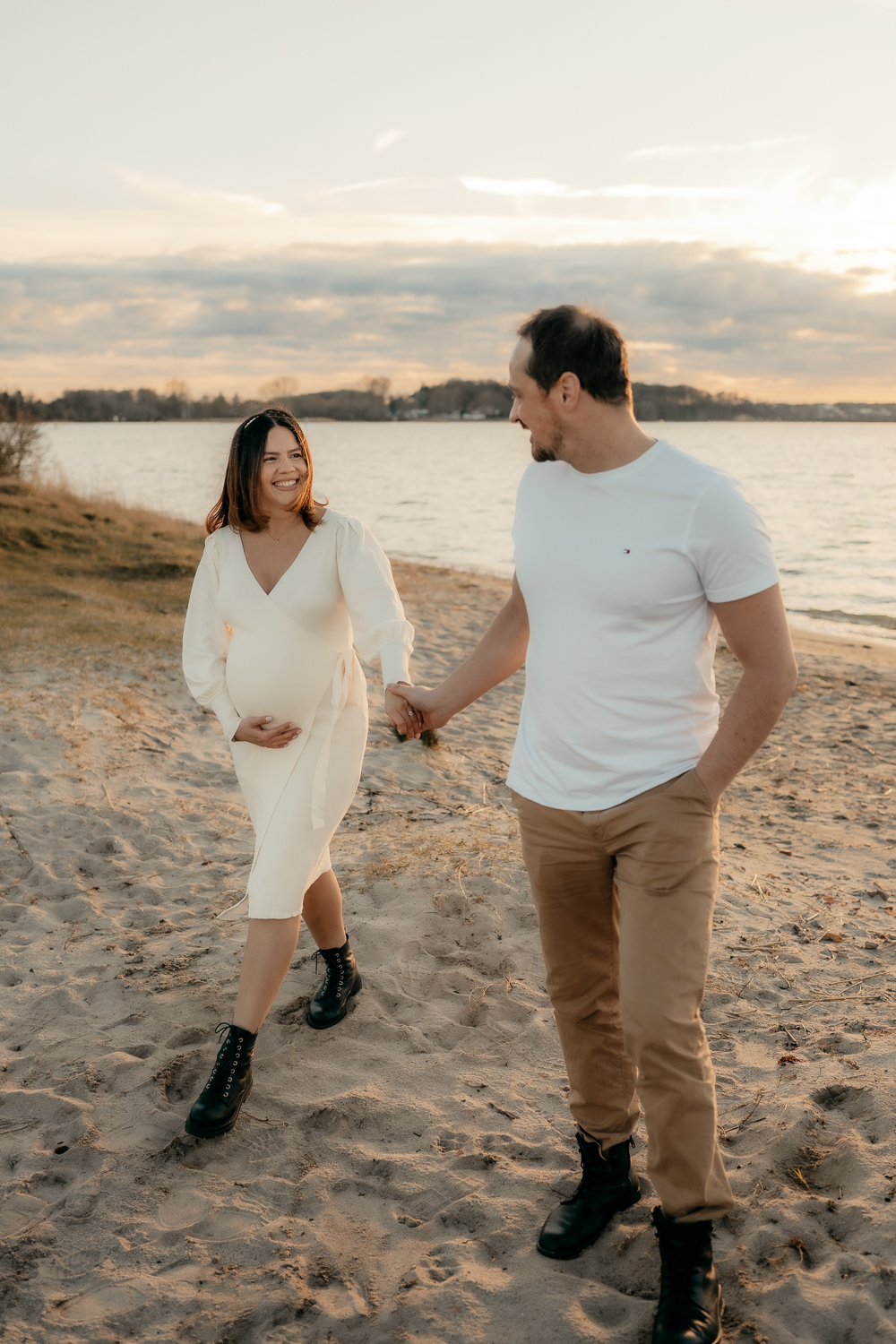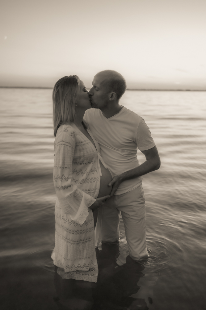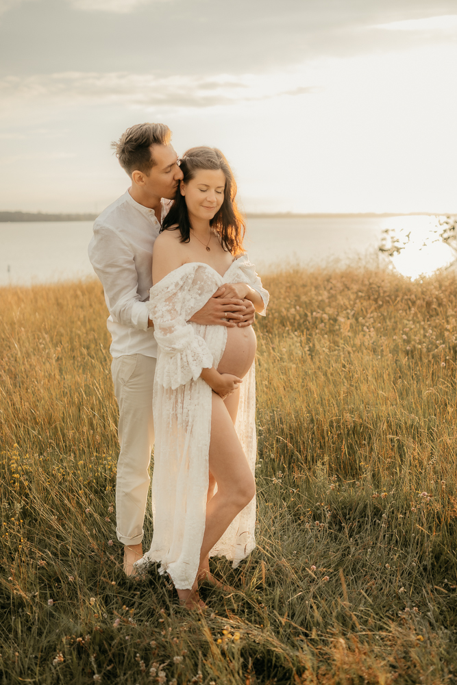 Für emotionale und ästhetische Fotos vom Babybauch empfehle ich immer das sanfte Licht des Sonnenuntergangs zu nutzen, aber auch der Morgen bietet dieses wunderschöne sanfte Licht – wenn es bewölkt ist, eignet sich jede Tageszeit.