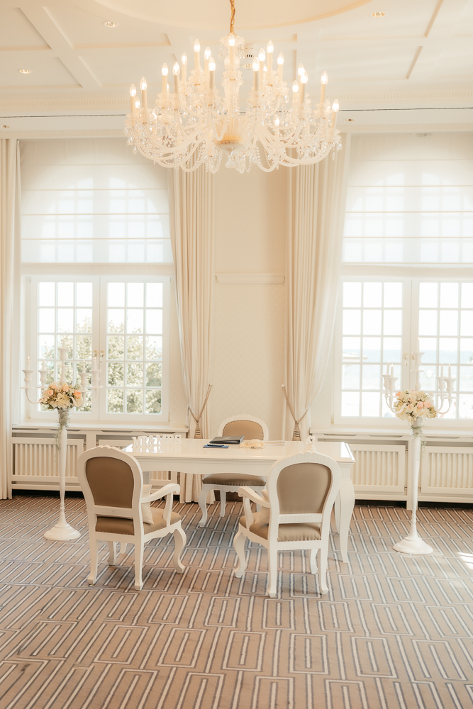 Das Kurhaus Binz liegt direkt an der Strandpromenade und strahlt eine ganz eigene Magie aus. Die imposante Architektur erinnert an eine andere Zeit und verleiht jeder Trauung eine besondere Eleganz. Hohe Decken, historische Details und das stilvolle Ambiente machen diese Location perfekt für ästhetische Hochzeiten auf Rügen.