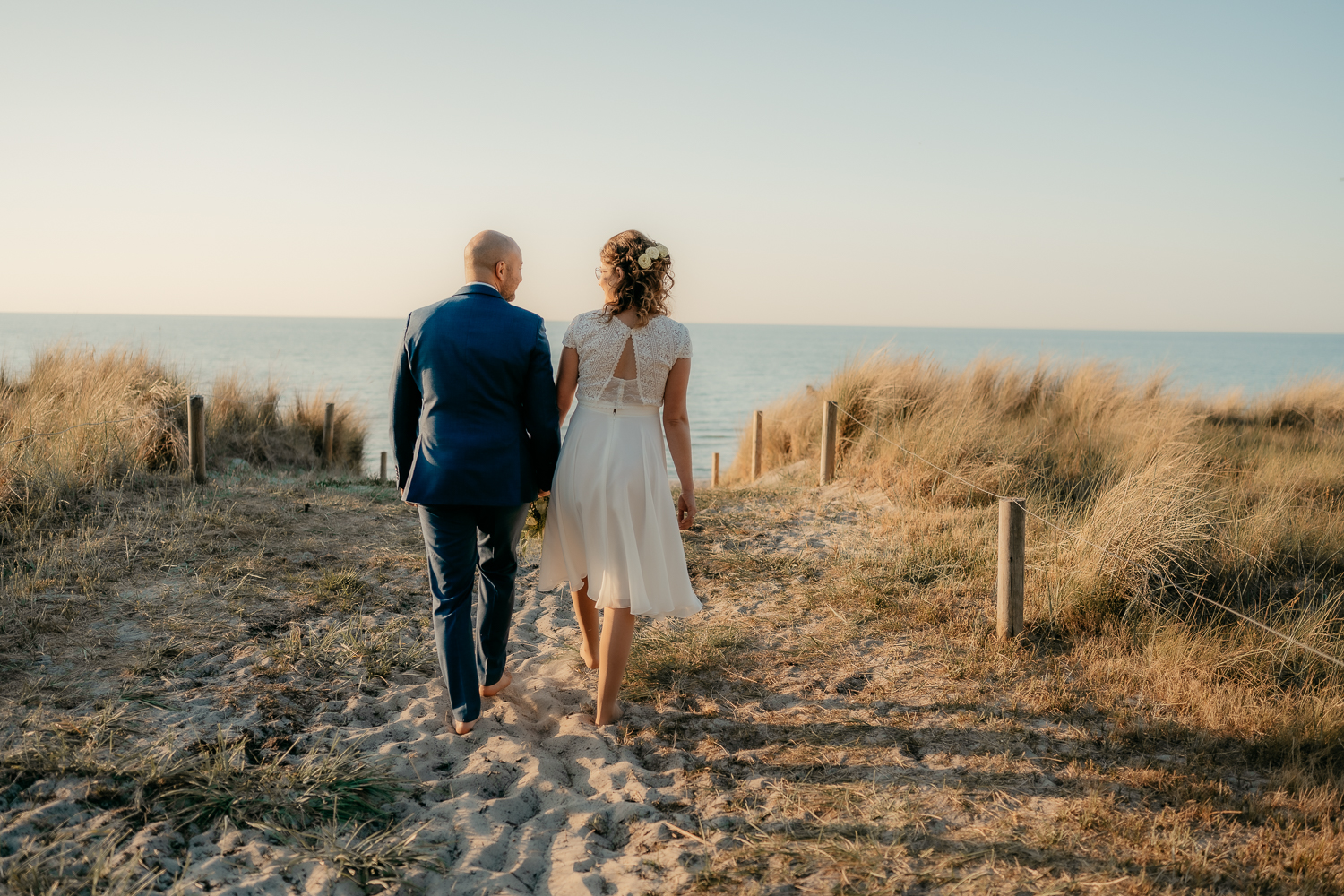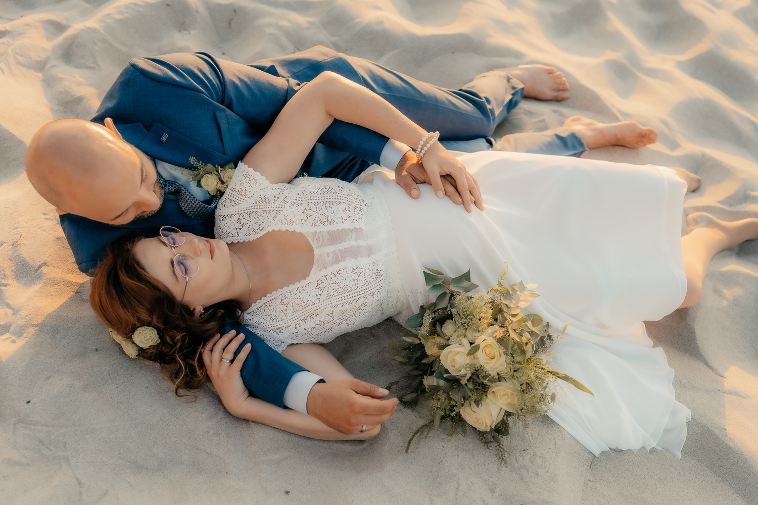 Dieses After-Wedding-Shooting war mein absoluter Traum. Endlich ein Brautpaar, das sich traut auf den schönsten Sonnenuntergang zu hoffen. Und wir bekamen ihn. Es hätte nicht schöner sein können, denn wir hatten einen nahezu menschenleeren Strand, sanftes goldenes Licht und eine wunderbare kleine Familie. Ich kann nur immer wieder sagen, wie schön ein Fotoshooting im Sonnenuntergang ist. Es war wirklich magisch, einen der wichtigsten Tage im Leben meines Brautpaares an einem, so wunderschönen Ort zu beenden. Ich merkte schon am Anfang des Tages, dass mein liebes Brautpaar nicht gerne vor der Kamera steht. Doch sie merkten schnell, dass meine Fotoshootings nicht steif und à la „Bitte mal lächeln“ sind. Nein, wir verbringen einfach eine tolle Zeit zusammen, lachen, tanzen, träumen von der Zukunft. Somit öffneten sich diese beiden lieben Menschen schnell und wir konnten traumhaft schöne Erinnerungen an dieses einzigartigen Tag festhalten.