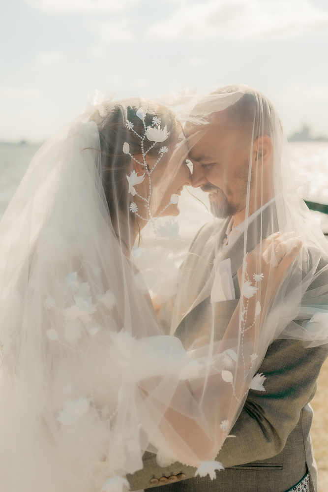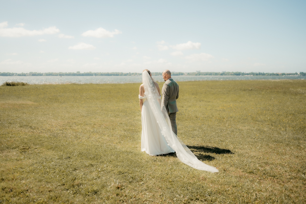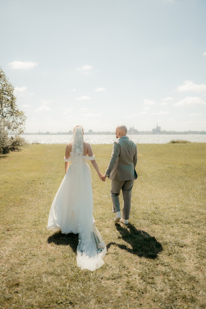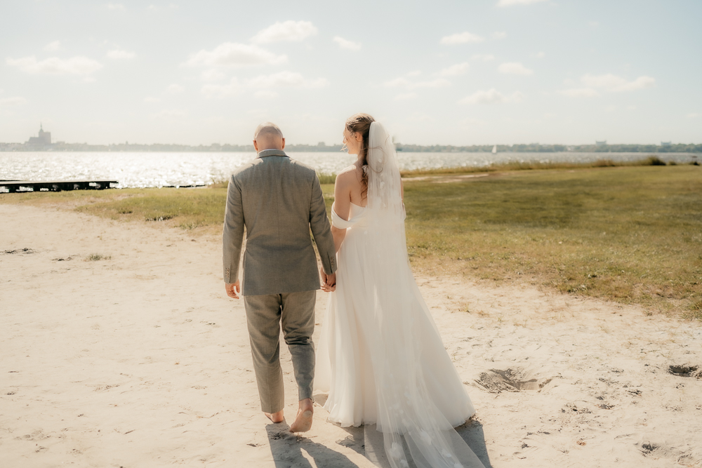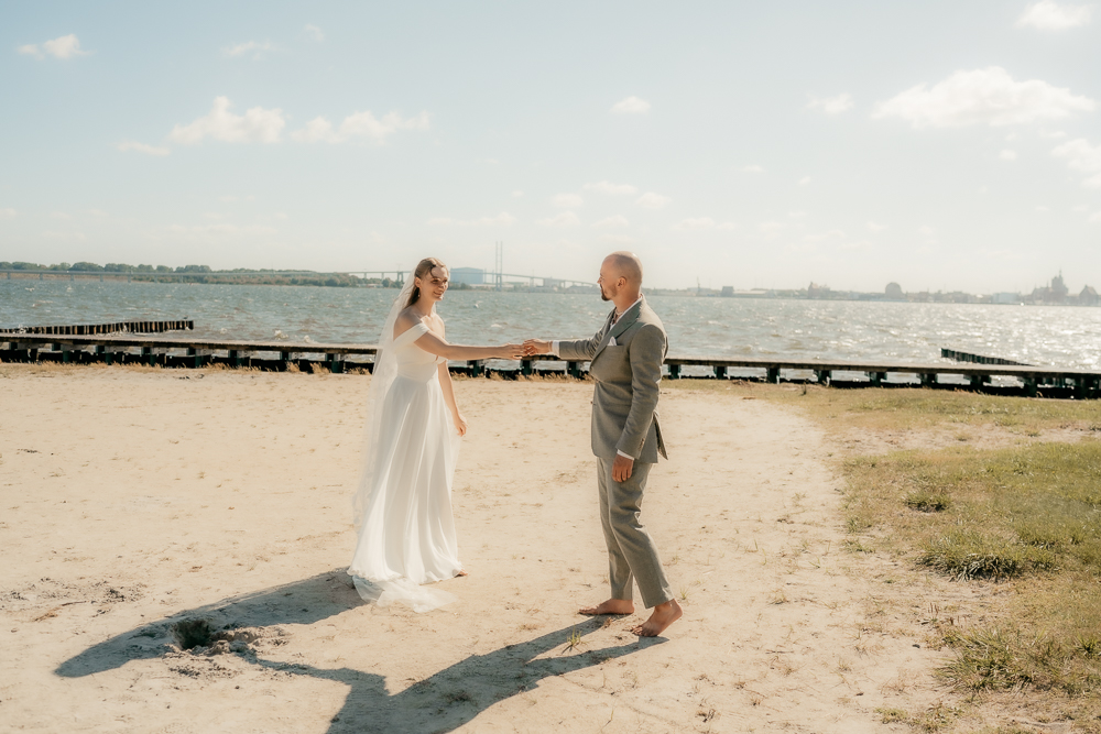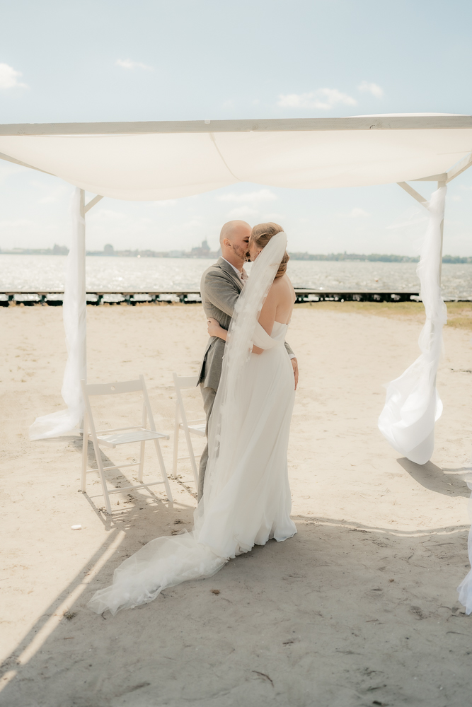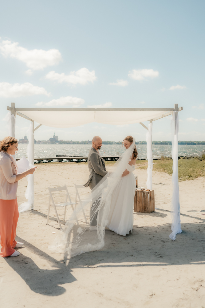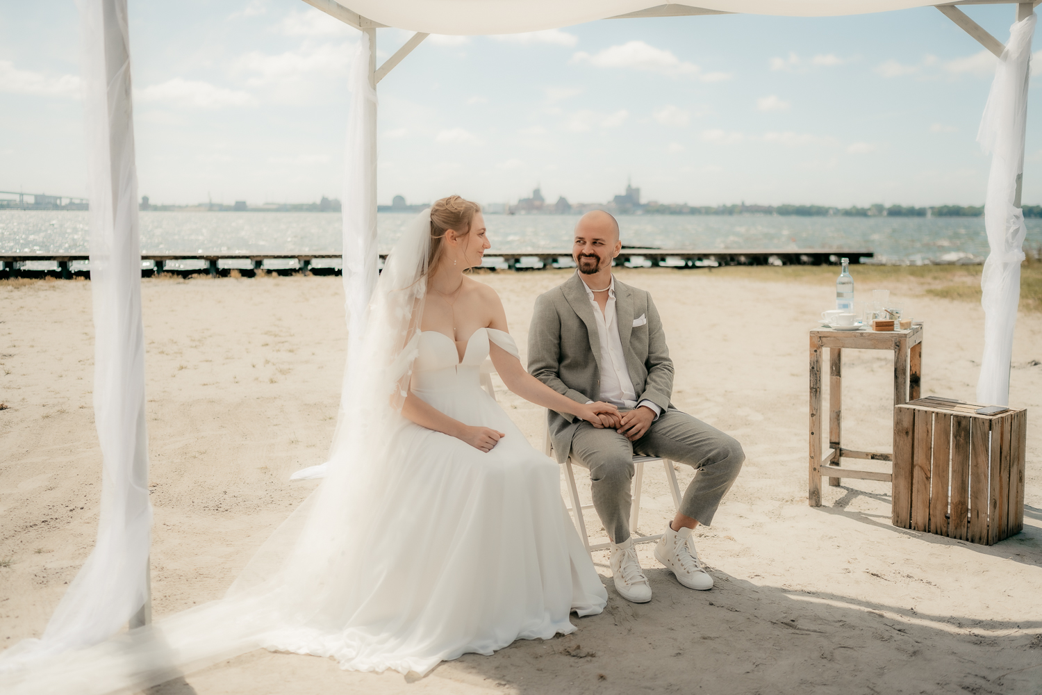 Das Brautpaar entschied sich für eine freie Trauung am Strand vor dem Strandhaus Altefähr, mit einem atemberaubenden Blick auf die historische Altstadt von Stralsund. Eine Kulisse, die kaum romantischer sein könnte.