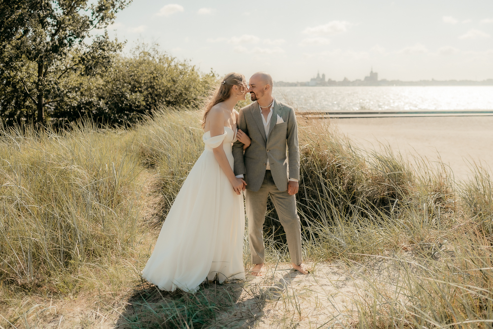 Der weite Strand, das ruhige Wasser und der Blick auf Stralsund schaffen eine Kulisse, die wie gemacht ist für unvergessliche Hochzeitsmomente.