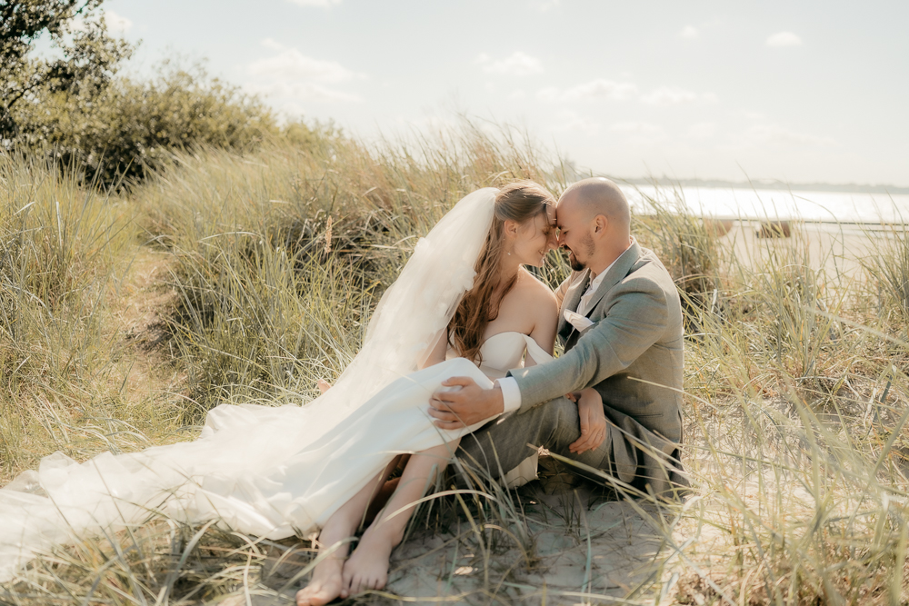 Nach dem Sektempfang nutzten wir die besondere Atmosphäre für ein entspanntes Brautpaarshooting am Strand von Altefähr.