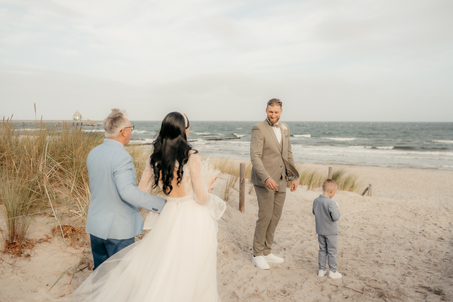 Ihr kleiner Sohn war überall dabei, lachte, staunte und brachte eine ganz eigene herzliche Energie in den Tag. Diese familiäre Verbundenheit macht meine Arbeit in der Hochzeitsfotografie in Zingst so einzigartig.