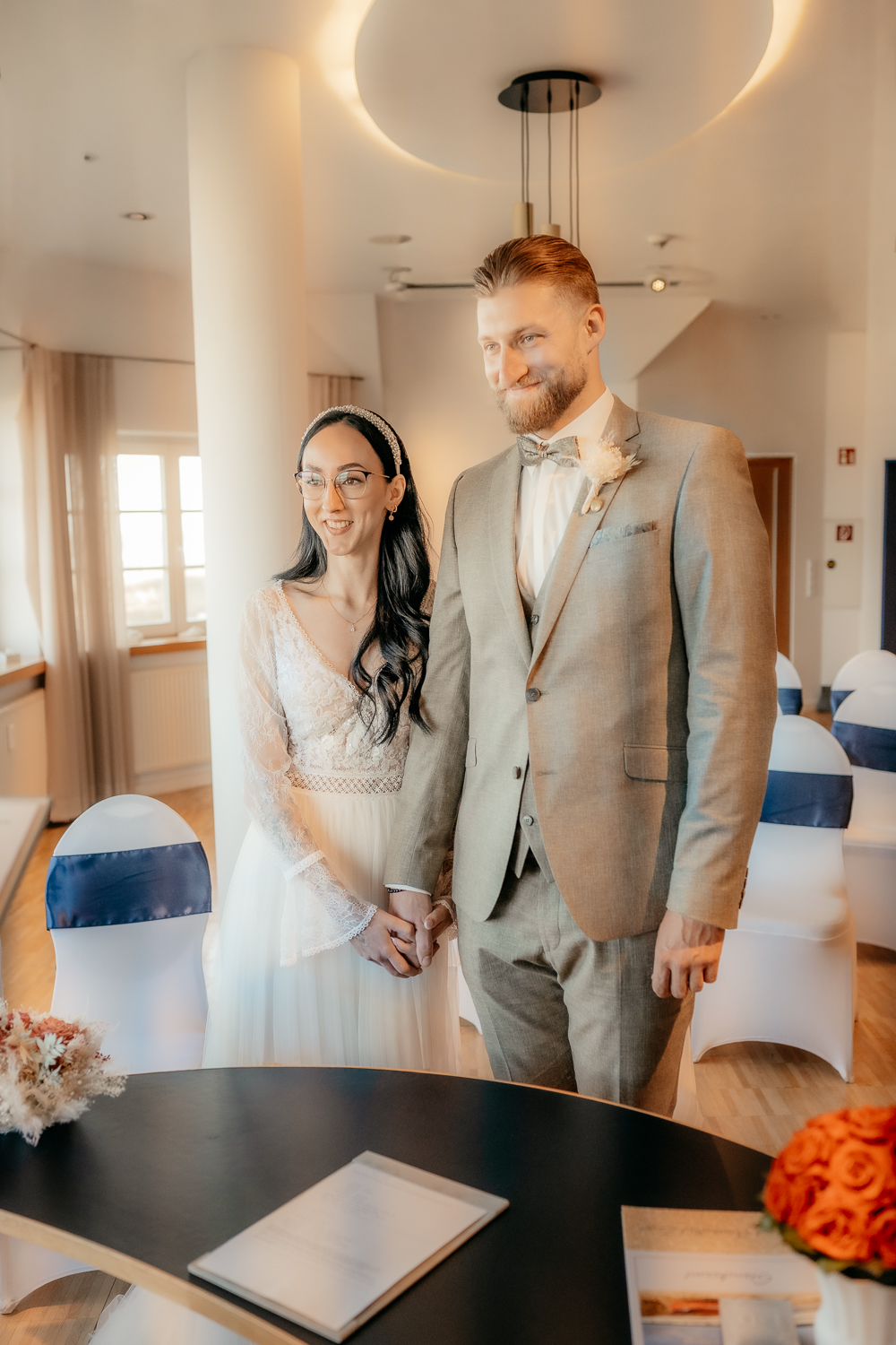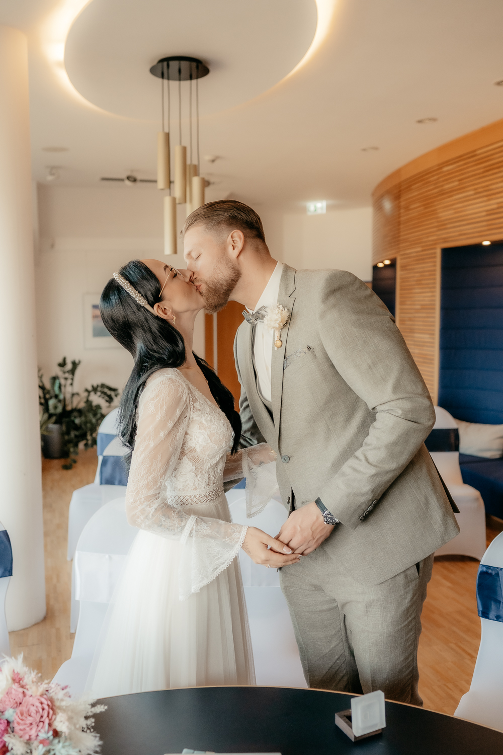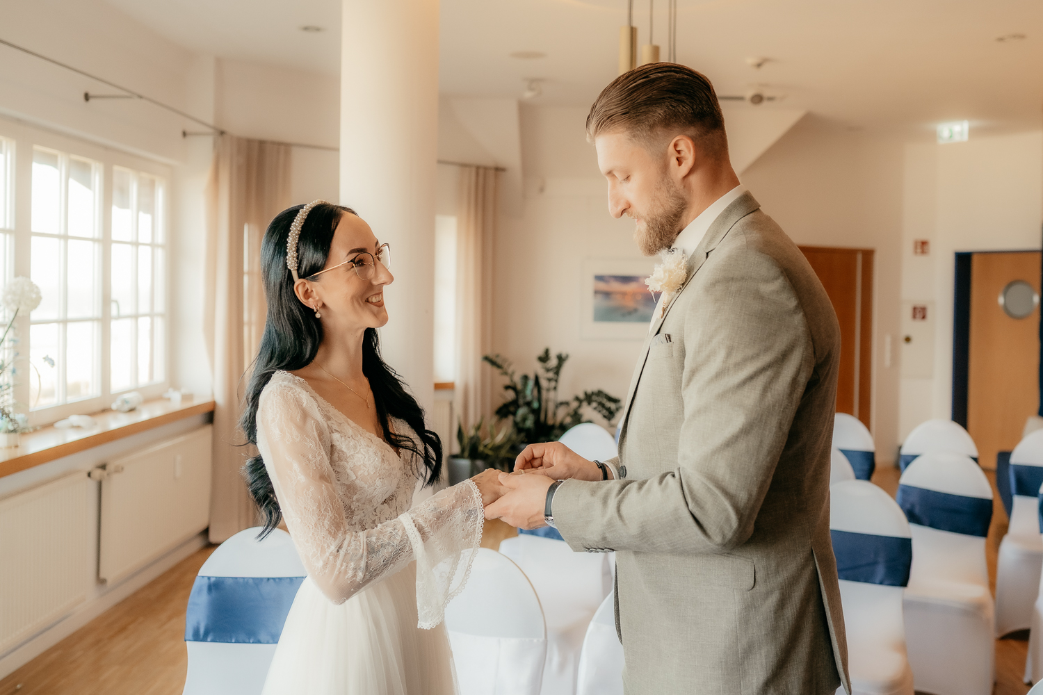 Die Trauung im Kurhaus Zingst war so natürlich und entspannt, wie man es sich für eine kleine Herbsthochzeit nur wünschen kann. Warme Atmosphäre, Blick auf die Ostsee und die Seebrücke – perfekter könnte man in Zingst heiraten kaum.