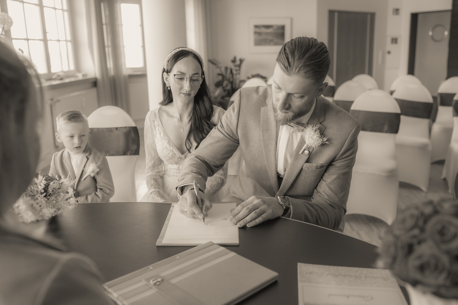 Gerade bei kleinen, intimen Hochzeiten ist das Getting Ready unglaublich wertvoll. Es rundet die Reportage ab, schafft Tiefe und erzählt all die kleinen Geschichten, die sonst im Trubel eines großen Hochzeitstages untergehen würden. Die ruhigen Sekunden, in denen die Braut tief durchatmet. Die Hände, die einander finden. Die leuchtenden Augen des kleinen Sohnes, der stolz über den Tag schwebt. All diese Momente verdienen ihren Platz.