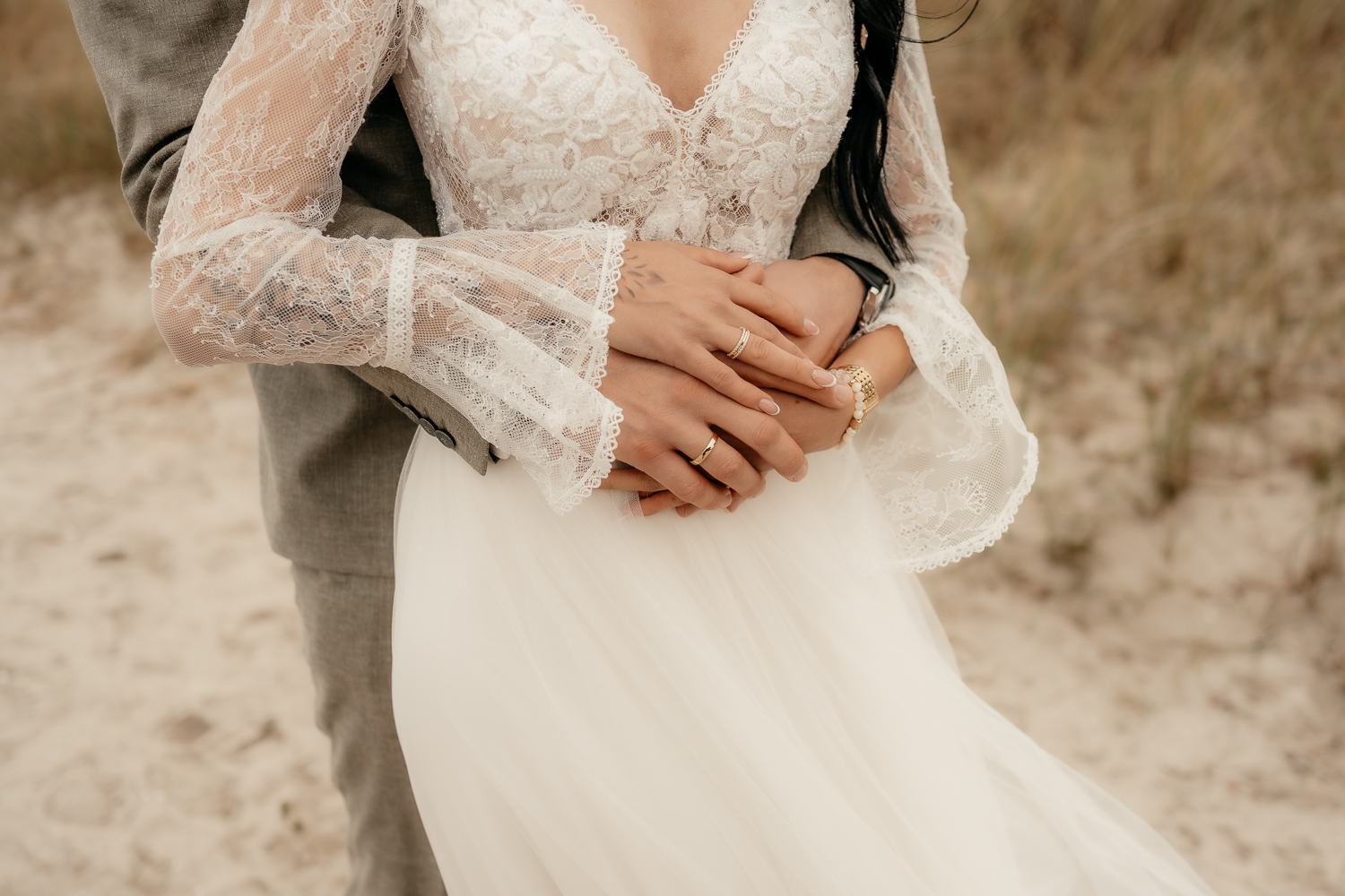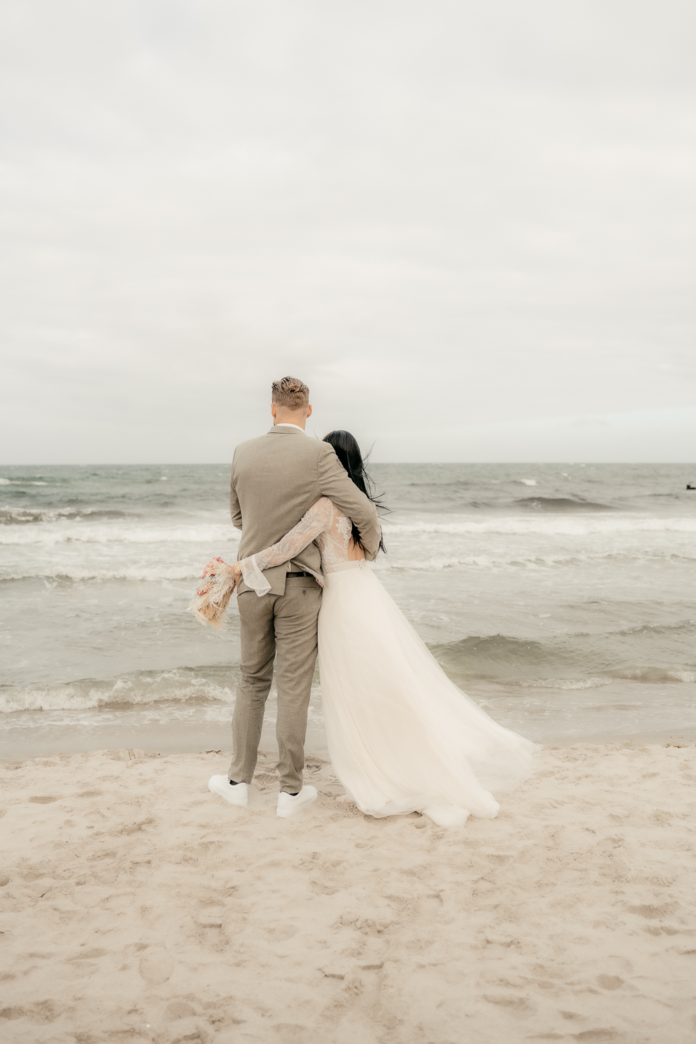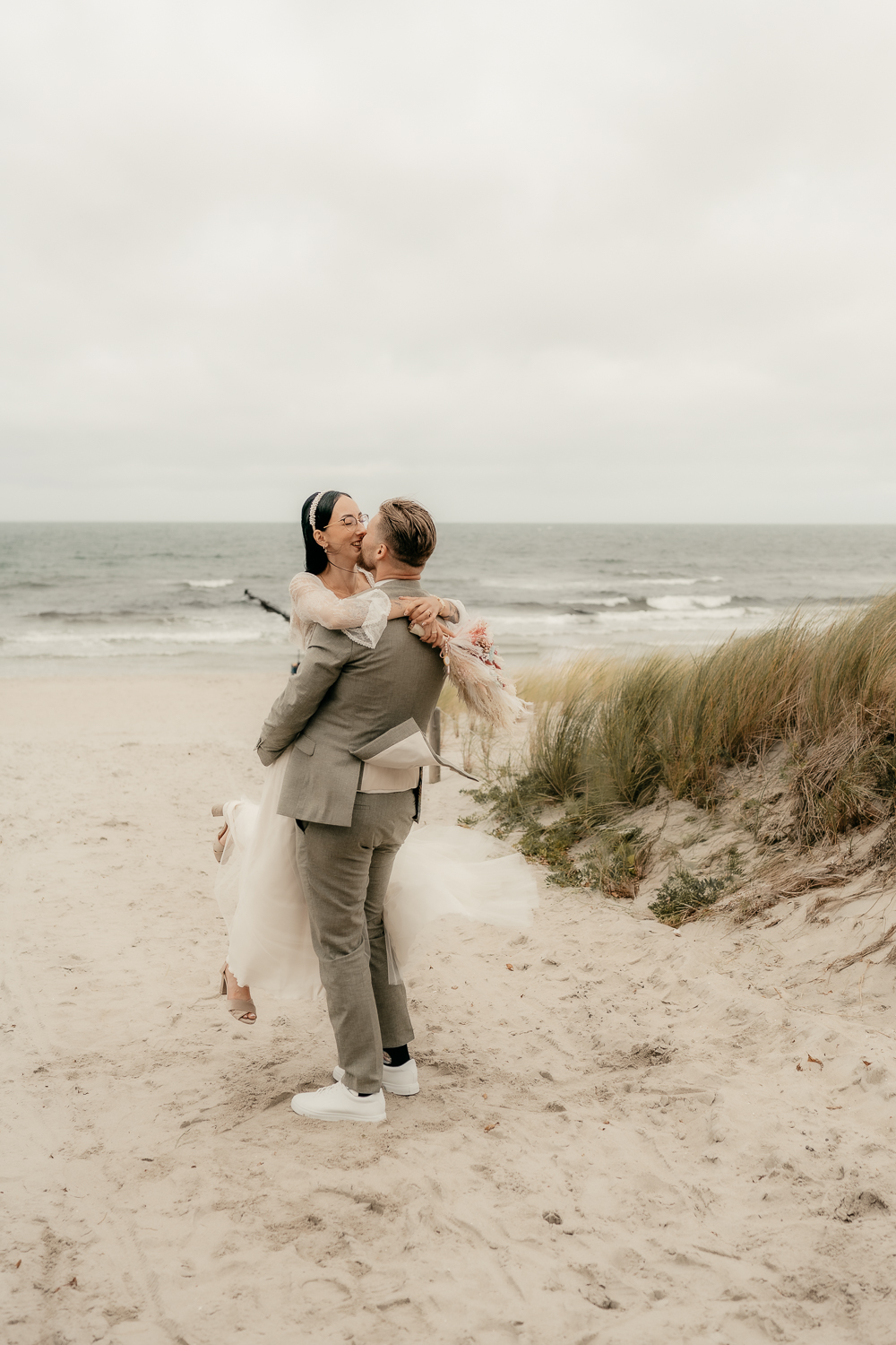 Nach der Trauung verbrachten wir Zeit am Strand. Ganz entspannt, ganz echt – so, wie es typisch ist für eine Hochzeit auf dem Darß oder an der Ostsee allgemein. Wir genossen die salzige Meeresluft, teilten liebevoll gebackene Hochzeitskekse und machten Brautpaarfotos, die genau das widerspiegelten, was diesen Tag so besonders machte: Nähe, Wärme, Authentizität.