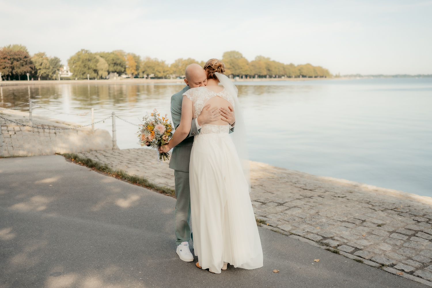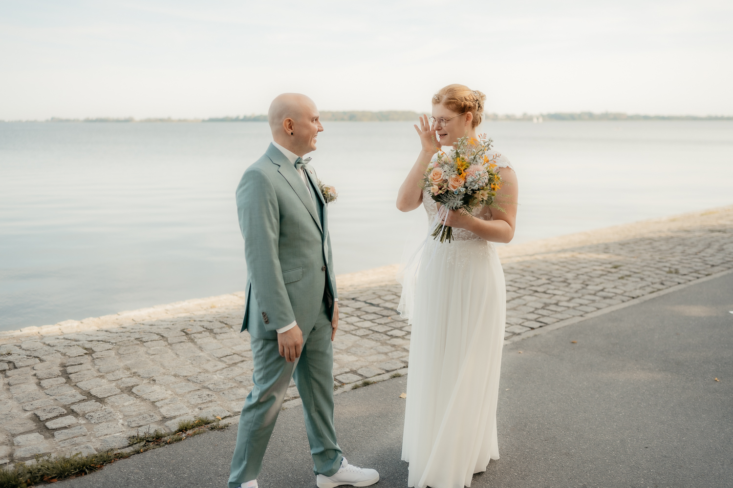Das sanfte Licht am Wasser, die frische Meeresbrise und die Weite des Horizonts boten eine traumhafte Kulisse für gefühlvolle Hochzeitsfotos in Stralsund.