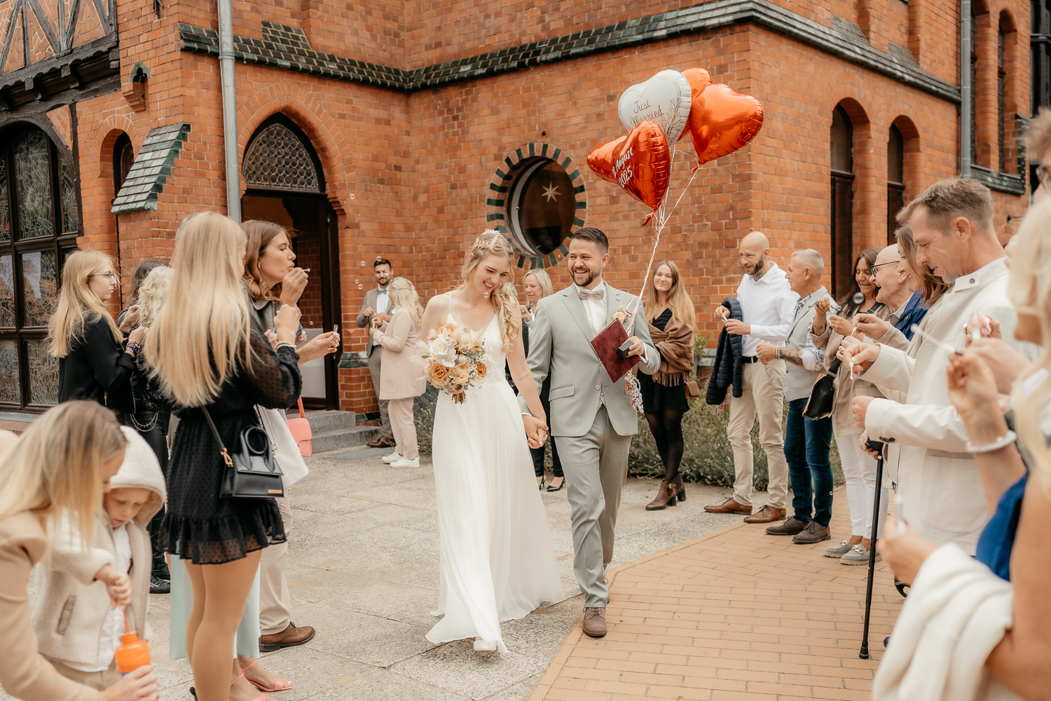 Nach der Trauung versammelte sich die Familie und die Freunde des Brautpaares in einem Spalier vor dem Möckelhaus. Durch Jubel und unzähligen Seifenblasen feierte das Brautpaar mit ihren liebsten.